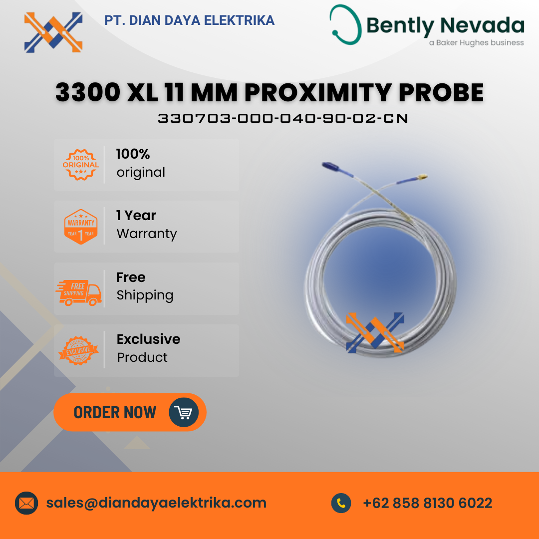 The part number 330703-000-040-90-02-CN identifies a Bently Nevada 3300 XL 11 mm Proximity Probe. This component is part of a transducer system used for non-contacting vibration and displacement measurements on industrial machinery.