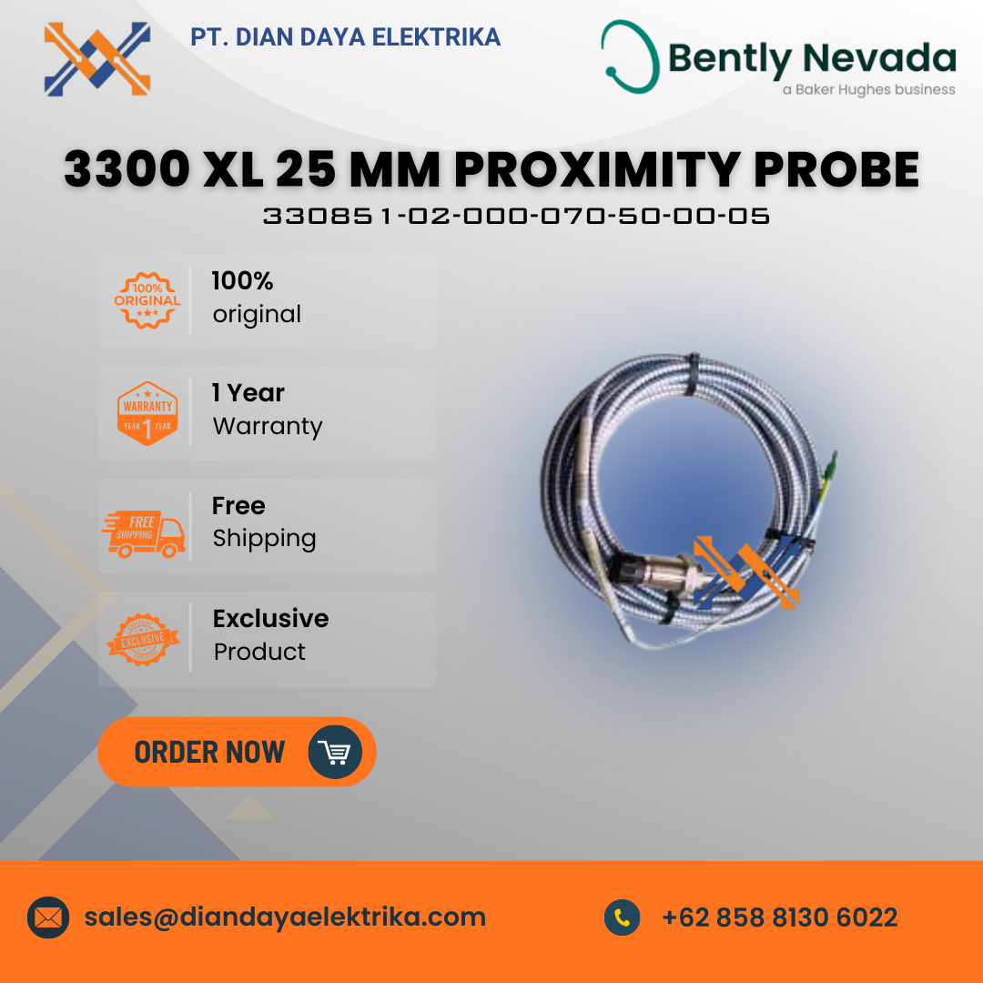 The Bently Nevada 330851-02-000-070-50-00-05 is a model number for a 3300 XL 25 mm Proximity Probe designed for industrial machinery condition monitoring systems. This probe is specifically built for harsh environments, such as those found in steam turbines, particularly for measuring differential expansion.
