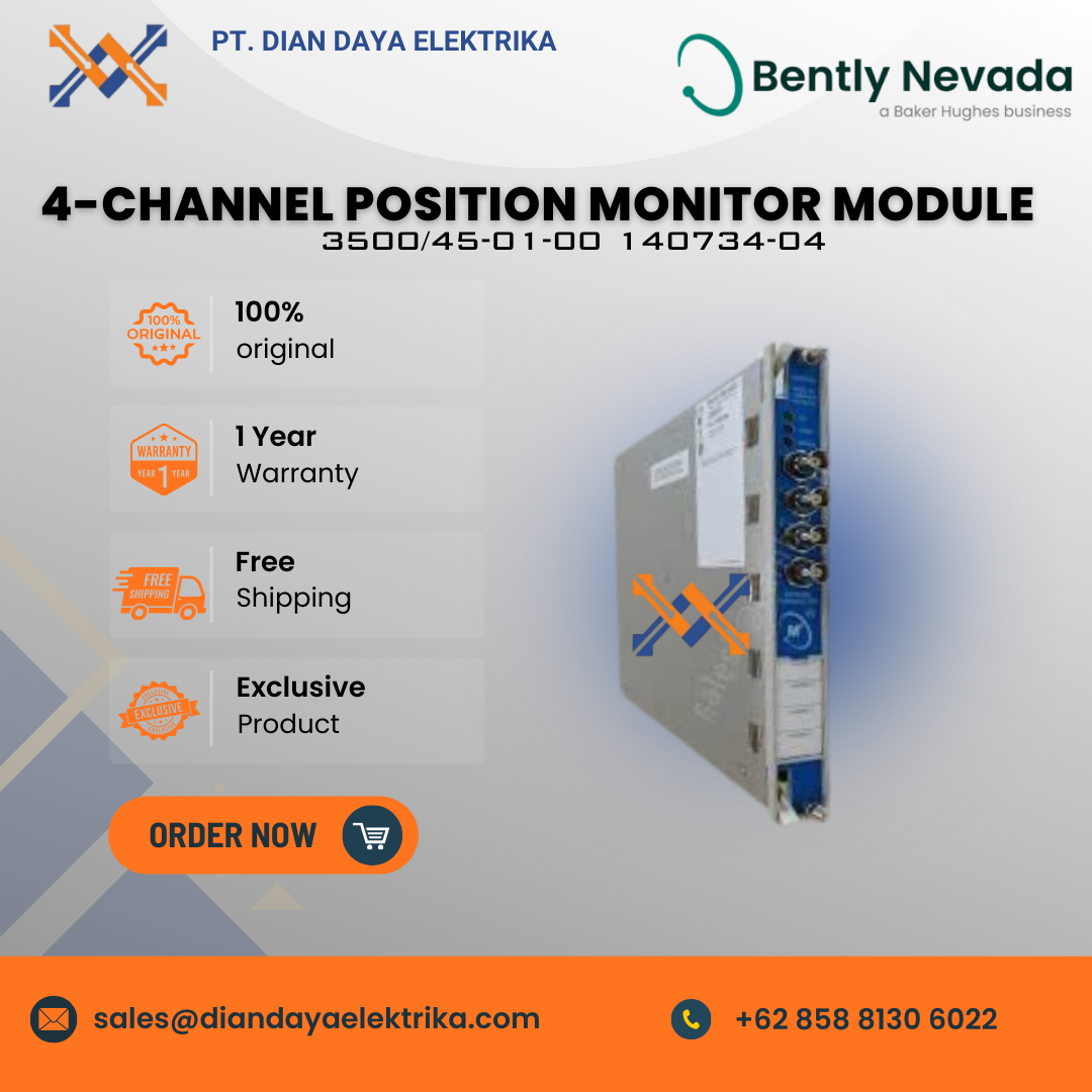 The Bently Nevada 3500/45-01-00 (Part Number 140734-04) is a 4-channel Position Monitor Module designed for the 3500 Series Machinery Protection System.