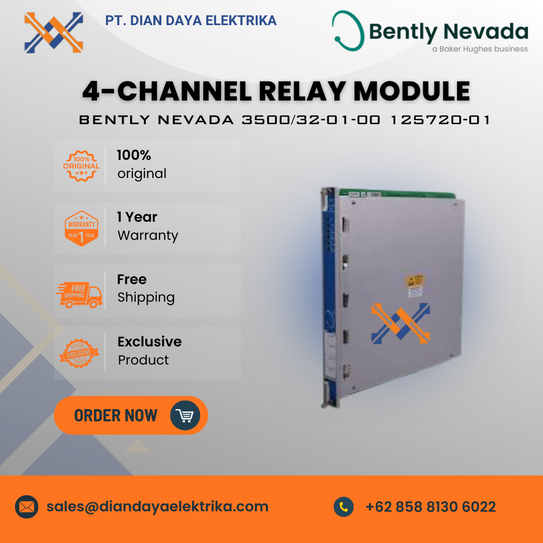 The Bently Nevada 3500/32-01-00 (associated with part number 125720-01) is a 4-Channel Relay Module used in the 3500 Series Machinery Protection System.