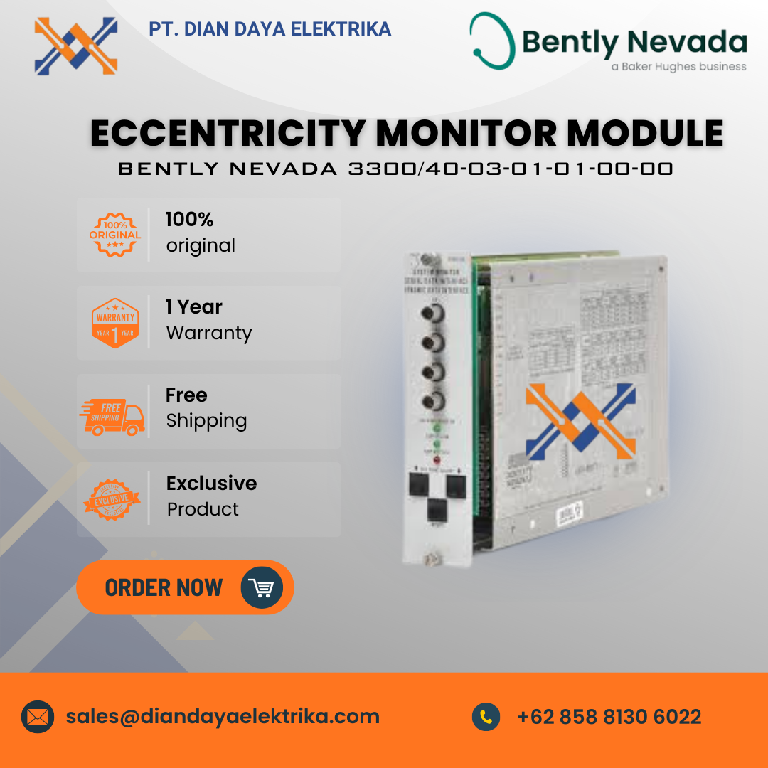 The Bently Nevada 3300/40-03-01-01-00-00 is an Eccentricity Monitor module from the legacy 3300 Series Monitoring System.