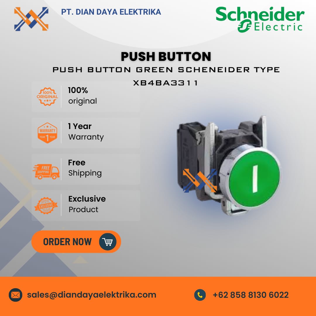 The Schneider Electric Harmony XB4 Type XB4BA3311 green push button is a complete, momentary switch with a 1NO (Normally Open) contact configuration, metal bezel, and a 22mm mounting diameter.
