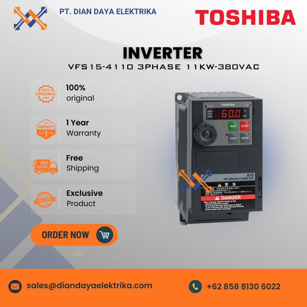 The Toshiba VFS15-4110 (often specified as VFS15-4110PL-W1) is an 11kW (15HP) vector inverter from the VF-S15 series, designed for 3-phase 380V to 500V AC input and output for controlling induction and permanent magnet motors.
